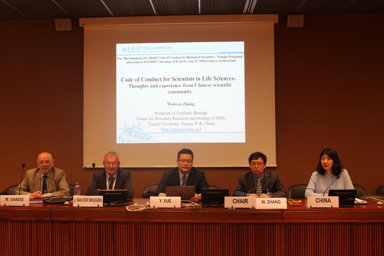 (通讯员薛杨 宋洁)为进一步推动中国与巴基斯坦代表团在第八次审议大会上递交的科学家行为准则(范本),在今年6月联合国《禁止生物武器公约》天津研讨会议所达成共识的基础之上,更为广泛地听取和吸收各缔约国组织和生物科学家的建议,应外交部邀请,天津大学生物安全战略研究中心于8月10日下午在日内瓦万国宫举办边会,中心主任张卫文教授作为边会主席及发言人主持会议,中国外交部军控司吕晓东副处长代表中国政府出席,并对边会表示支持。此外,天津大学法学院、生物安全战略研究中心薛杨博士,荷兰皇家科学院van der Bruggen博士,英国布拉德福德大学Dando教授作为发言人参与会议。此次边会受到各缔约国广泛关注,近90名各国代表及专家前往聆听。
