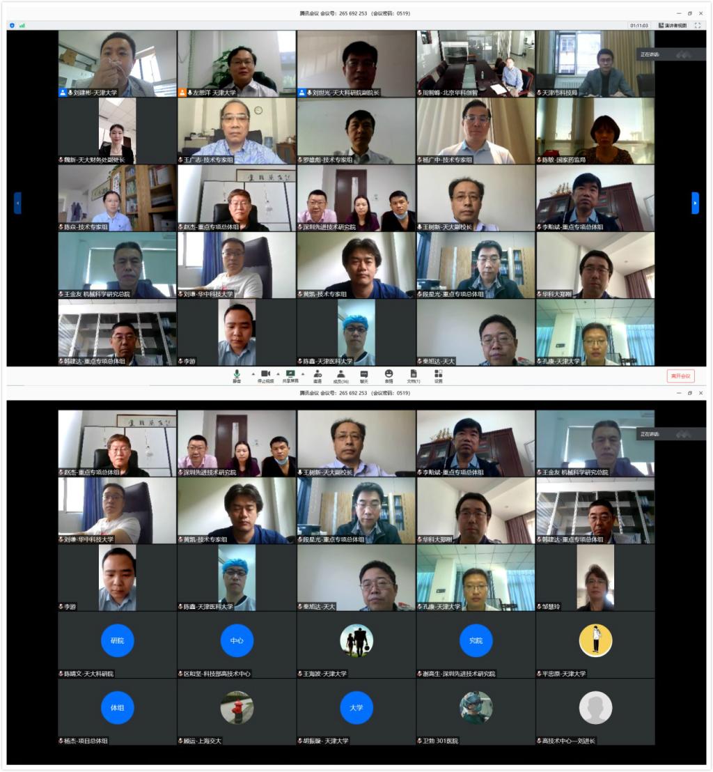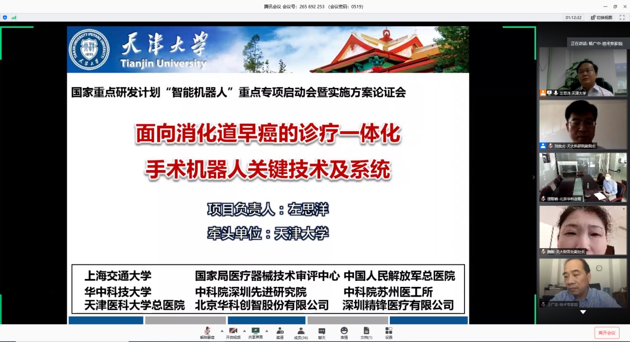 (通讯员:刘建彬 陈婧文)5月19日,天津大学作为项目牵头单位承担的国家重点研发计划“智能机器人”重点专项“面向消化道早癌的诊疗一体化手术机器人关键技术及系统”项目启动会暨实施方案论证会以视频会议形式顺利召开。科技部高技术研究发展中心区和坚处长、专项办负责人刘进长研究员、专项主管刘璐,天津市科技局高新处负责人谭振东、周明调研员,“智能机器人”专项总体专家组组长哈尔滨工业大学赵杰教授、副组长南开大学韩建达教授、机械科学研究总院王金友教授,项目责任专家北京理工大学段星光教授、山东大学李贻斌教授,项目技术专家组英国皇家工程院杨广中院士、清华大学王广志教授、厦门大学罗雄彪教授、天津大学陈焱教授、中山大学黄凯教授以及项目总体组和用户委员会的领导和专家应邀参加了此次会议,天津大学副校长王树新、财务处副处长魏欣、项目首席科学家左思洋教授、项目牵头单位及参与单位科研管理部门代表、课题负责人和骨干成员近50人参加了本次会议,会议由天津大学科研院副院长刘世光主持。