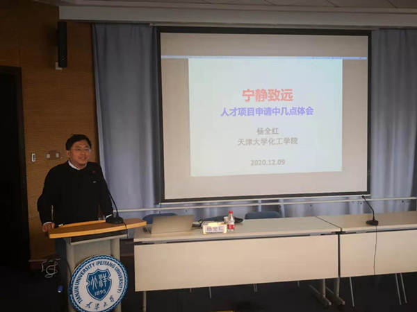 (通讯员 舒识宇 朱广明)12月9日下午,天津大学基础研究项目申报经验交流会在卫津路校区召开,会议邀请化工学院教授、国家杰出青年科学基金项目获得者杨全红教授做项目申报经验交流报告,科研院副院长杨博,院长助理傅平青、耿德超出席会议,各单位及附属医院相关青年教师到场参会,会议由杨博主持。