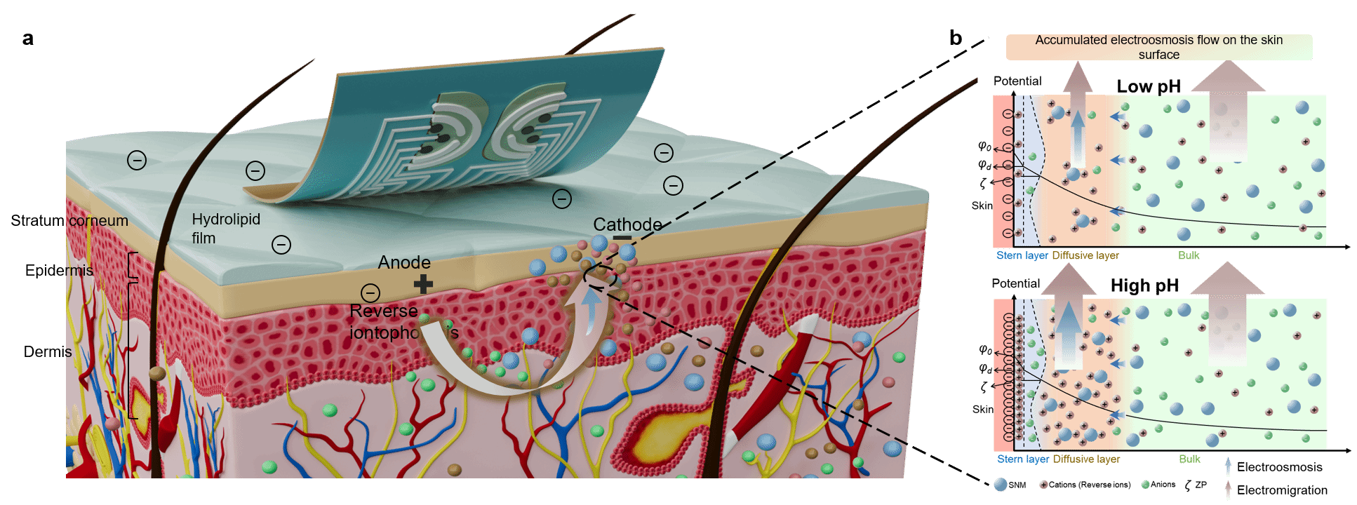 非侵入式生物标志物动态监测是疾病早期诊断、慢性病管理及健康评估的重要发展方向,其核心优势在于避免侵入性采样带来的痛苦与感染风险,提升患者依从性。传统侵入式检测(如指尖采血等)操作繁琐、采样频次有限,还难以实现连续动态监测;部分微创技术(如植入式传感器)虽能提供连续数据,但易受体内复杂环境(如生物干扰、组织反应)影响,且存在舒适度差等问题。组织液作为生物标志物的重要来源,其非侵入式提取与分析成为研究热点,其中反离子电渗(RI)技术通过低强度电流驱动组织液透皮迁移,为无创伤监测提供了可行路径。RI概念提出后,相关技术在葡萄糖等标志物监测中得到应用(如GlucoWatch®),但因皮肤刺激、环境干扰(如汗液)、提取稳定性差等问题未能普及。近年来,柔性电子技术虽改善了佩戴体验,但检测准确性仍然未能达到临床应用需求。论文首次发现,皮肤表面pH会随反离子电渗组织液提取/检测而变化,进而显著影响提取通量和生物标志物检测精度。论文从理论和实验的角度系统研究了该影响机制,发现随着反离子电渗组织液提取和检测生化反应的进行,皮肤表面会产生H+累积,而皮肤的自我恢复作用又会抑制这种累积,使得皮肤表面局部pH发生波动;另一方面,皮肤角质层中的角蛋白带有负电荷,这种pH波动会改变角蛋白表面的ζ电位,进而显著影响电渗流强度,电渗流强度的变化会显著影响葡萄糖提取通量,从而影响后续监测结果的稳定性和准确性;与此同时,pH的变化还会显著影响酶传感器的灵敏度。在以上机制研究基础上,论文提出了一种基于表皮pH监测的校正方法,并应用于非侵入式葡萄糖动态监测,大幅提升了监测精度。论文工作主要包括:
