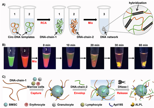 图.用于捕获干细胞的DNA水凝胶网络的设计。A)通过滚环扩增方法(RCA)合成超长DNA链,以及通过DNA链之间碱基互补配对形成三维DNA网络的示意图。B)DNA网络形成过程中的分子扩散和相转化。DNA链-1和DNA链-2分别用SYBR Green II和Gel Red染色。C)高效捕获、三维包封和酶促释放的示意图:1)捕获:将DNA链-1与骨髓间充质干细胞(BMSC)孵育,适体Apt19S锚定BMSC;2)包封:引入DNA链-2以触发DNA网络的形成,三维包封BMSC;3)释放:DNA网络可被核酸酶DNase I降解,释放BMSC。