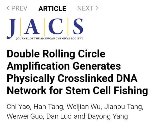 论文信息:Chi Yao+, Han Tang+, Weijian Wu, Jianpu Tang, Weiwei Guo, Dan Luo, Dayong Yang*, Double Rolling Circle Amplification Generates Physically Crosslinked DNA Network for Stem Cell Fishing.Journal of the American Chemical Society,2020.