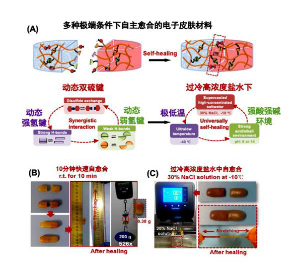 天津大学张雷、杨静团队利用不同性质的亲水基团与双硫基团,成功合成了可在多种极端条件下快速自愈合的弹性体材料。团队充分利用了不同动态键的协同相互作用,使材料在不借助任何外界能源的条件下,能够同时实现高弹性、高拉伸性和快速修复损伤的功能。根据实验结果显示,这种新型自愈合材料在室温下可实现10分钟内快速愈合,愈合后可承受超过自身重量500倍的重物。在零下40度低温、过冷高浓度盐水下甚至在强酸强碱性环境中都表现出了高效的自愈合性能,堪称一种优异的“全天候”自愈合材料。