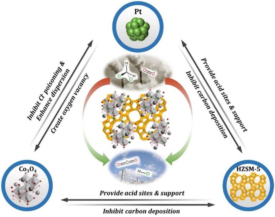 日前,天津大学环境学院“大气环境与生物能源团队”(http://catalysis.tju.edu.cn/)以工业常见的含氯挥发性有机物二氯甲烷(DCM)为目标污染物,制备合成Pt-Co/HZSM-5三元催化剂,对DCM的催化氧化行为及机理进行研究。研究表明,Co3O4能够有效锚定Pt原子,实现Pt的单原子分散;而单原子Pt又增加了Co3O4表面氧空位,从而增强其氧化还原性能。在DCM催化氧化过程中,DCM吸附在HZSM-5表面的酸性位点上并解离,然后在Pt和Co的协同作用下完全氧化。这项工作实现了DCM在相对低温(249°C)条件下的完全氧化,大大减少了副产物的生成,并且催化剂具有长时稳定性,为揭示三元催化剂活性的影响因素以及设计高效催化剂提供了研究基础。