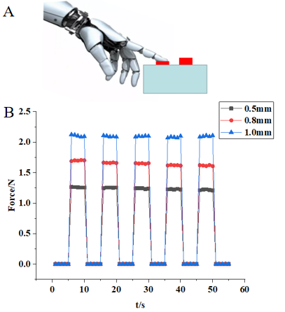 为了演示触觉传感器,以普通按钮开关为实验样品。触觉感应装置位于按钮开关的上侧,触觉感应装置逐渐按下,然后抬起,同时测量其力值。当压缩位移为0.5、0.8和1.0 mm时,记录力值。力值为0.5,0.8,和1 mm分别为1.23890±000286、1.6494±0.000981和2.0958±0.000168 N。