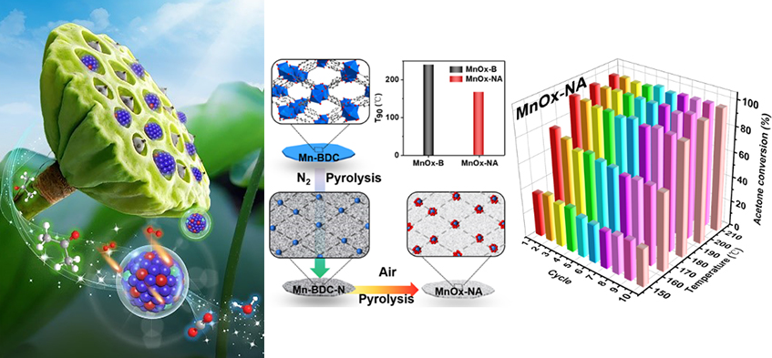 日前,天津大学环境学院刘庆岭教授团队(http://catalysis.tju.edu.cn/)从大自然中吸取灵感,观察到莲蓬能够很好地分散莲子。于是设计了“原位碳限域-氧化”策略,即对金属有机骨架材料(MOFs)进行两步热解,利用其在惰性氛围衍生的碳物种对金属氧化物生长进行限域,制备具有充分暴露氧空位的超小MnOx纳米粒子(5.6 nm)。实现在低温下丙酮的去除(T90 = 167 ℃)。此外,MnOx在长期、循环、耐水和耐硫等测试中也表现出优异的稳定性。这项工作不仅制备了一种很有前途的去除VOCs的材料,而且为合理设计氧空位丰富的超小纳米颗粒提供了研究基础和新策略。