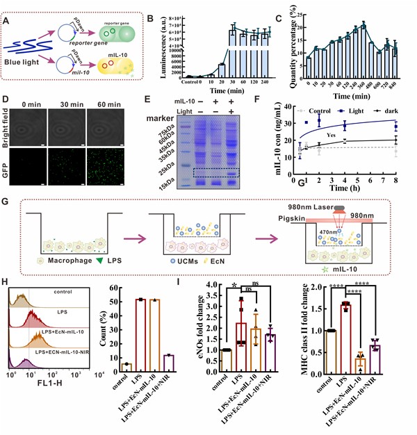 2)光响应口服益生菌制剂的制备:受检者可根据医嘱自行服用重组工程菌口服制剂。其中双组分微球(MGPs)对近红外(NIR)光和pH敏感,通过口服进入靶标肠道,释放UCMs和益生菌。重组益生菌原位分泌免疫抑制因子(白细胞介素-10)消除肠道炎症和修复粘膜损伤。