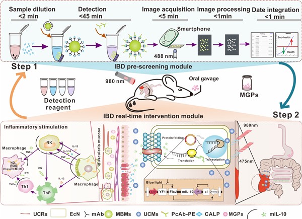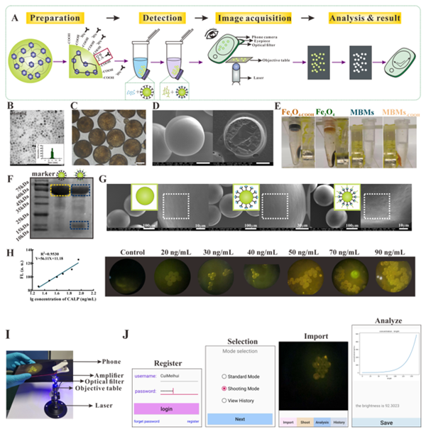 1)基于智能手机图像处理的视觉光学诊断传感器的构建:免疫磁性微凝胶(MBMs)捕获炎症性肠病粪便标志物—钙卫蛋白(calprotectin, CALP)。荧光传感器用于放大目标信号。智能手机辅助图像放大采集器联合自行编写的APP (Detector)实现检测结果的数字化显示。便于受检者及时了解病程并将诊断结果与医务人员实时共享,以便寻求合理用药。