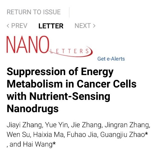 论文信息:Jiayi Zhang+, Yue Yin, Jie Zhang, Jingran Zhang, Wen Su, Haixia Ma, Fuhao Jia, Guangjiu Zhao*, and Hai Wang*,Suppression of Energy Metabolism in Cancer Cells with Nutrient-sensing Nanodrugs. Nano Letters, 2022.
