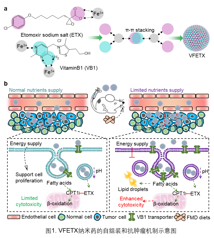 用营养物底物(例如糖,氨基酸,维生素)修饰的纳米载体可以靶向肿瘤细胞选择性过表达的转运体,从而实现小分子药物的靶向递送,并在提高小分子药物疗效和生物安全性方面具有极大的应用潜力。近期,来自天津大学理学院的赵广久教授课题组与国家纳米科学中心的王海研究员课题组设计了一种营养感知的纳米药VFETX。基于维生素B1(VB1) 分子中嘧啶基和(etomoxir sodium salt) ETX分子中羧基与Fe3+的配位以及有利于分子间Π-Π堆积的芳香基团,纳米药VFETX由 VB1、ETX和Fe3+通过简单和绿色的一锅法配位自组装而成。作者发现VFETX纳米药可以主动靶向肿瘤细胞膜表面VB1转运体,FMD治疗上调了肿瘤细胞VB1转运体(ThTr1/ThTr2)的表达,增加了营养感知纳米药VFETX的细胞摄取和肿瘤积累。FMD 治疗和VFETX纳米药,通过抑制脂肪酸代谢和能量供应,明显抑制了肿瘤生长而没有明显的副作用。该工作为FMD辅助功能化纳米递药系统的肿瘤能量调控和肿瘤治疗策略开辟了新思路。