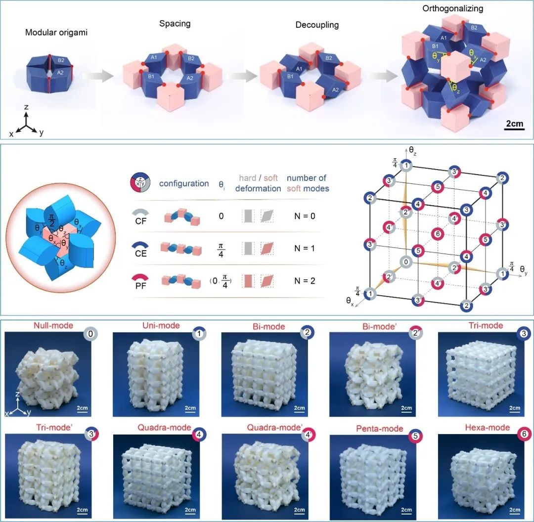 机械超材料能够提供自然材料不具备的非常规特性,如负泊松比、梯度刚度、非互易响应等。另一方面,模块化折纸等柔性结构也为机械超材料带来了可重构特性和零能量变形模式。这其中,零能量变形模式最引人注目的应用当属五模式超材料,它能够用来设计声学”隐身”斗篷,其它模数的超材料也有着新颖独特的应用。然而,能够覆盖零模、一模、二模、三模、四模、五模乃至六模超材料的系统设计至今仍未被提出和实现。