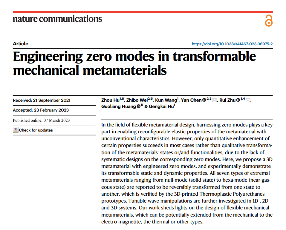 近日,天津大学机械工程学院陈焱教授团队联合北京理工大学宇航学院朱睿教授团队,提出了一种具有可调模数的变构型超材料,通过设计机构自由度相互解耦的三维模块化折纸结构,实现了从零模式到六模式的设计空间覆盖以及构型之间的可逆转换,使用热塑性聚氨酯3D打印模型样机,验证了多种参数配置下超材料的静力学零能量特征,并对不同维度下多模材料的可编程极化波控制功能进行了探索和验证,为可编程变构型超材料在声学、光学、电磁学等多个领域的应用提供了参考。该成果以Engineering Zero Modes in Transformable Mechanical Metamaterials为题于2023年3月7日在线发表于国际权威期刊《自然·通讯》(Nature Communications)。论文共同通讯作者为天津大学陈焱教授、北京理工大学朱睿教授,共同第一作者为北京理工大学博士生胡洲、天津大学博士生魏志波。