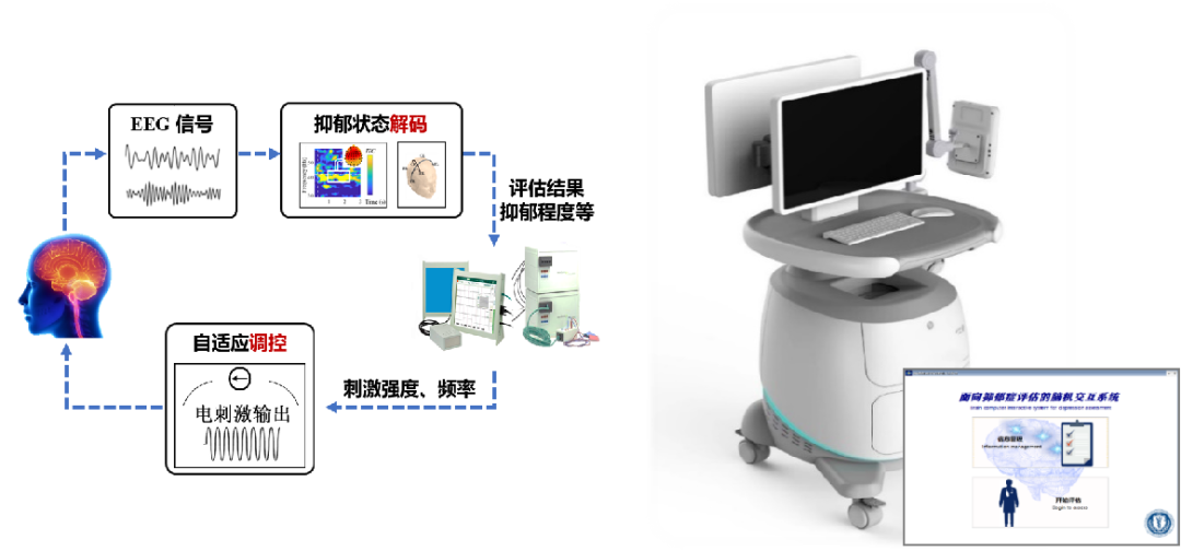 基于以上成果,刘爽带领团队进一步自主研发了国内首款面向抑郁评估的情感脑机交互机器人系统“神工-神心”。它的使用过程十分简单,患者只需戴上采集头部信号的设备,系统通过声音刺激诱发用户听觉稳态响应,采集脑电信号并解码情绪信息,构建识别模型,机器人就会根据患者的大脑信号,在短时间内对用户进行全面、客观的抑郁评估,实现抑郁症的智能化评估,并为患者的个性化治疗提供科学依据。