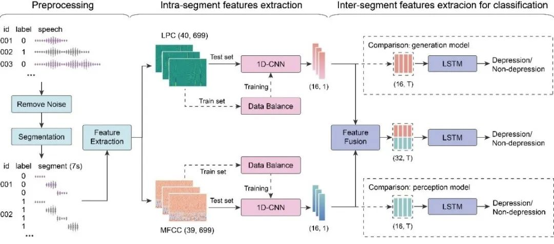 除了依靠电生理和行为分析技术,团队还进一步设计了基于语音信号的非接触式抑郁识别技术,提出了一种适用于抑郁语音识别的机器语音链模型,利用声音的物理特征而不是文本信息进行抑郁评估,该模型在不同语言和采集范式的多个数据集上都表现出了良好的泛化能力和识别性能。研究结果同时表明,抑郁症患者的声道特性或已发生变化,为抑郁症语音研究提供了理论基础和启发。相关成果发表于国际精神病学领域TOP期刊《Journal of Affective Disorders》。