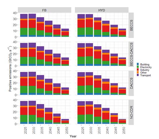 图3.采用FB和HYD模式下不同领域的碳排放