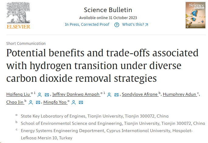 近期,天津大学先进内燃动力全国重点实验室尧命发教授、刘海峰教授,环境学院金超副教授在多样化碳捕集方法下交通部门使用氢能的潜在效益和权衡领域取得新进展。利用全球气候变化的综合评估模型(GCAM),研究了在多样化的碳捕集方法下,将整个交通部门转向氢燃料的潜在优势以及对排放、能源、土地、食物、水和经济的折衷影响。该工作以题为“Potential benefits and trade-offs associated with hydrogen transition under diverse carbon dioxide removal strategies”的论文发表在中国科学院、国家自然科学基金委员会主办的自然科学综合性顶级学术期刊《Science Bulletin》 。天津大学先进内燃动力全国重点实验室刘海峰和留学生Jeffrey Dankwa Ampah为论文共同第一作者,刘海峰、Jeffrey Dankwa Ampah、金超和尧命发为论文通讯作者。该研究得到国家自然科学基金专项项目和面上项目的资助支持。