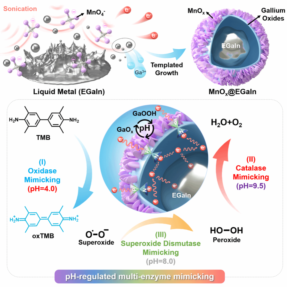 镓铟液态金属(EGaIn)是一种在室温下呈液态的高导热、导电性金属材料,具有电子传输快、生物相容性好、稳定性高和易于回收等优异特性,在机械工程、生物医学、能源和电子学多领域均展现出广阔的应用前景。液态金属还凭借其强大的还原能力和独特的表面两性氧化物层,能够在化学反应中产生新的活性位点,并有效控制电子的传输,这为开发具有可调控催化性能的纳米材料提供了全新的可能性(图1),但如何进一步提升这些相关材料的多酶活性和循环利用性能,仍是实现工业应用的关键与挑战。