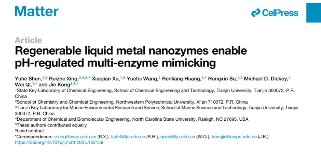 近期,天津大学化工学院齐崴教授、黄仁亮教授团队与西北工业大学化学与化工学院孔杰教授、邢瑞哲副教授团队合作在可再生液态金属纳米酶领域取得新进展,成功制备了具有核壳结构的锰基/镓铟液态金属纳米酶(MnOx@EGaIn),实现了不同pH环境下多酶样活性的模拟和可逆再生制备。研究证实液态金属纳米酶可形成独特的GaOx/MnOx异质结构,通过电子“门控效应”实现催化活性的调控。相关工作以题为 “Regenerable Liquid Metal Nanozymes Enable pH-regulated Multi-enzyme-mimicking” 的论文发表于Cell旗下姊妹刊Matter上,天津大学化工学院助理研究员申雨禾、西北工业大学化学与化工学院邢瑞哲副教授、天津大学化工学院博士生许晓坚为论文共同第一作者,天津大学为第一通讯单位(图2)。研究得到国家自然科学基金、国家重点研发计划、中国博士后基金、化学工程与低碳技术全国重点实验室等资助支持。此项工作也是天津大学酶工程与技术课题组在液金及纳米酶领域(Matter, 2023, 6(7): 2248-2262., Angew. Chem. Int. Ed. 2023, 202309830.; ACS Catalysis 2021, 11, 5839.; Appl. Catal. B. Environ. 2019, 254, 452.; Chem. Eng. J. 2021, 416, 129149.)的又一新进展。