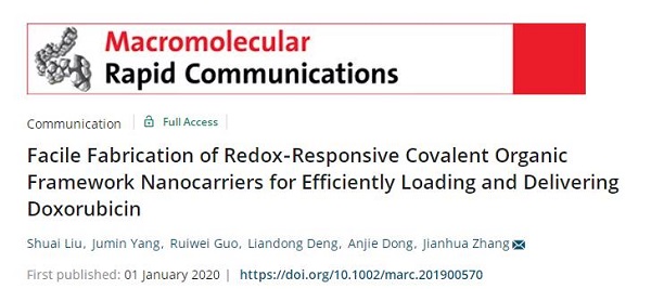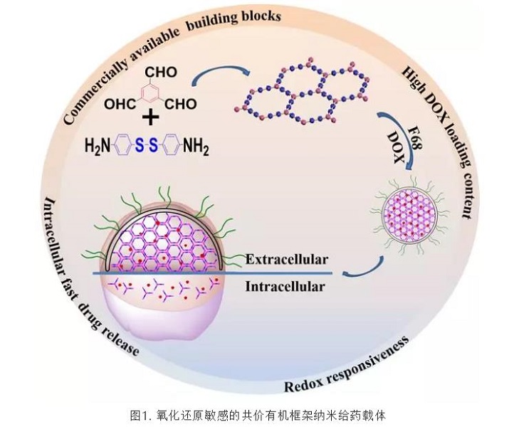 天津大学化工学院张建华副教授课题组开发了一种简易、高效、低成本制备富含二硫键的共价有机框架纳米给药载体的新方法,构筑基元简单易得,所制备纳米载体不仅能高效负载阿霉素,还能智能感应肿瘤细胞内的特异性氧化还原微环境,从而发生解体并快速释放药物。
