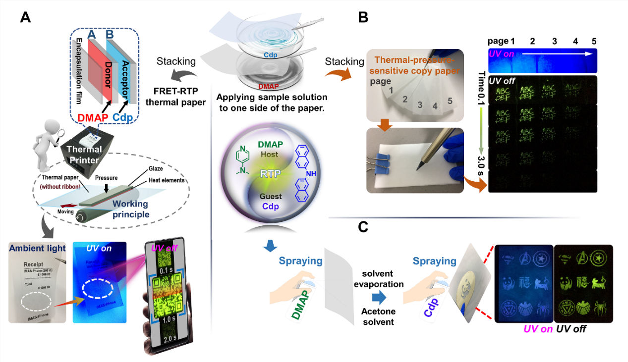 研究人员利用主-客体掺杂体系中距离调控的共振能量转移(FRET, Förster Resonance Energy Transfer)过程,开发了具有刺激响应特性的RTP材料。FRET在不同环境下的广泛适应性和主-客体体系的良好磷光性能共同提高了材料体系的实用性。利用该策略制备的材料不仅与现有印刷技术展现出完美的兼容性,而且FRET客体与主体之间的特异性识别也被成功应用于信息加密。该工作首次揭示了FRET过程在宏观RTP刺激响应材料构筑方面的巨大潜力,提出了一种简单、廉价、有效并极具商业潜力的有机室温磷光材料构造策略。