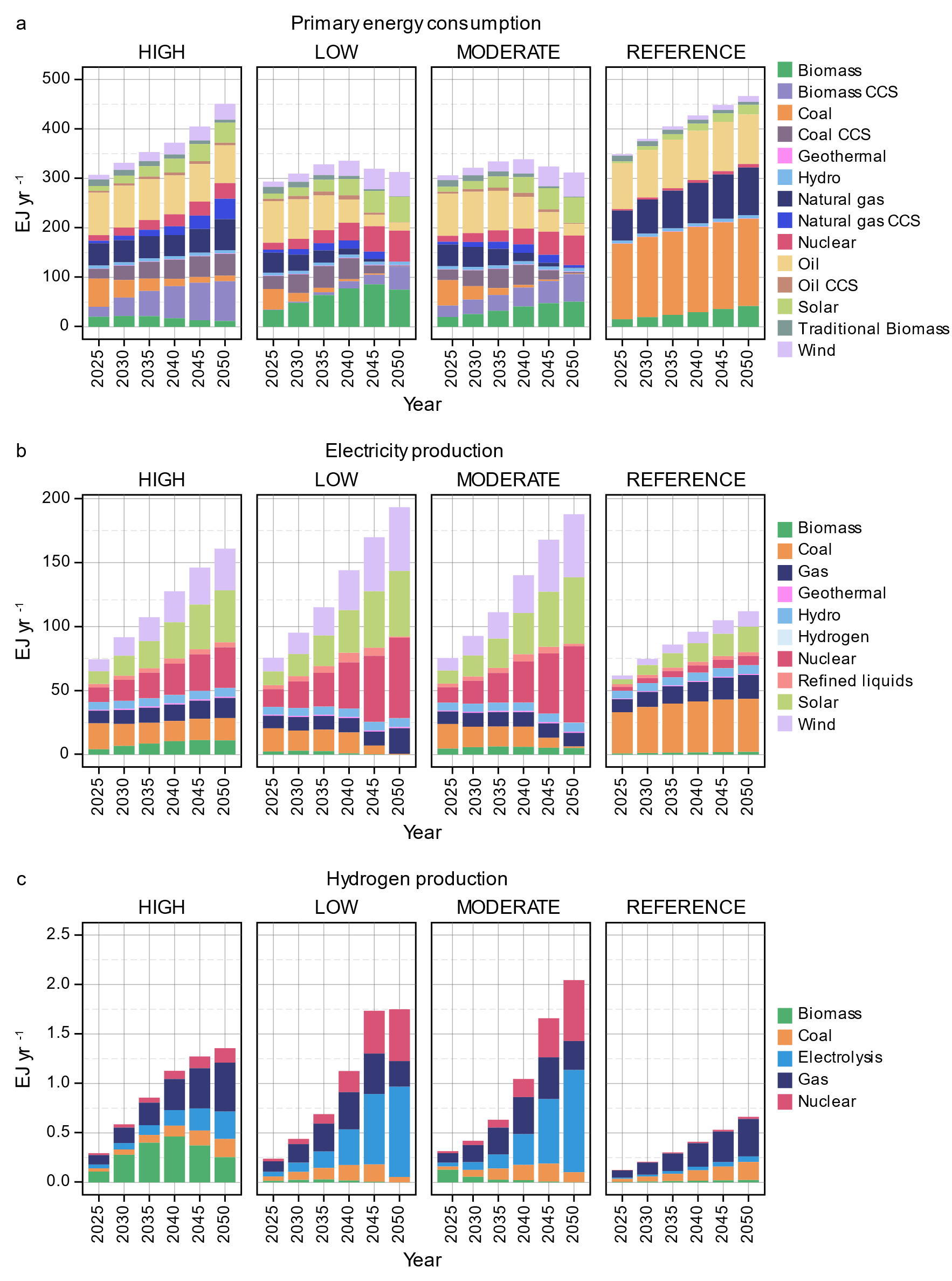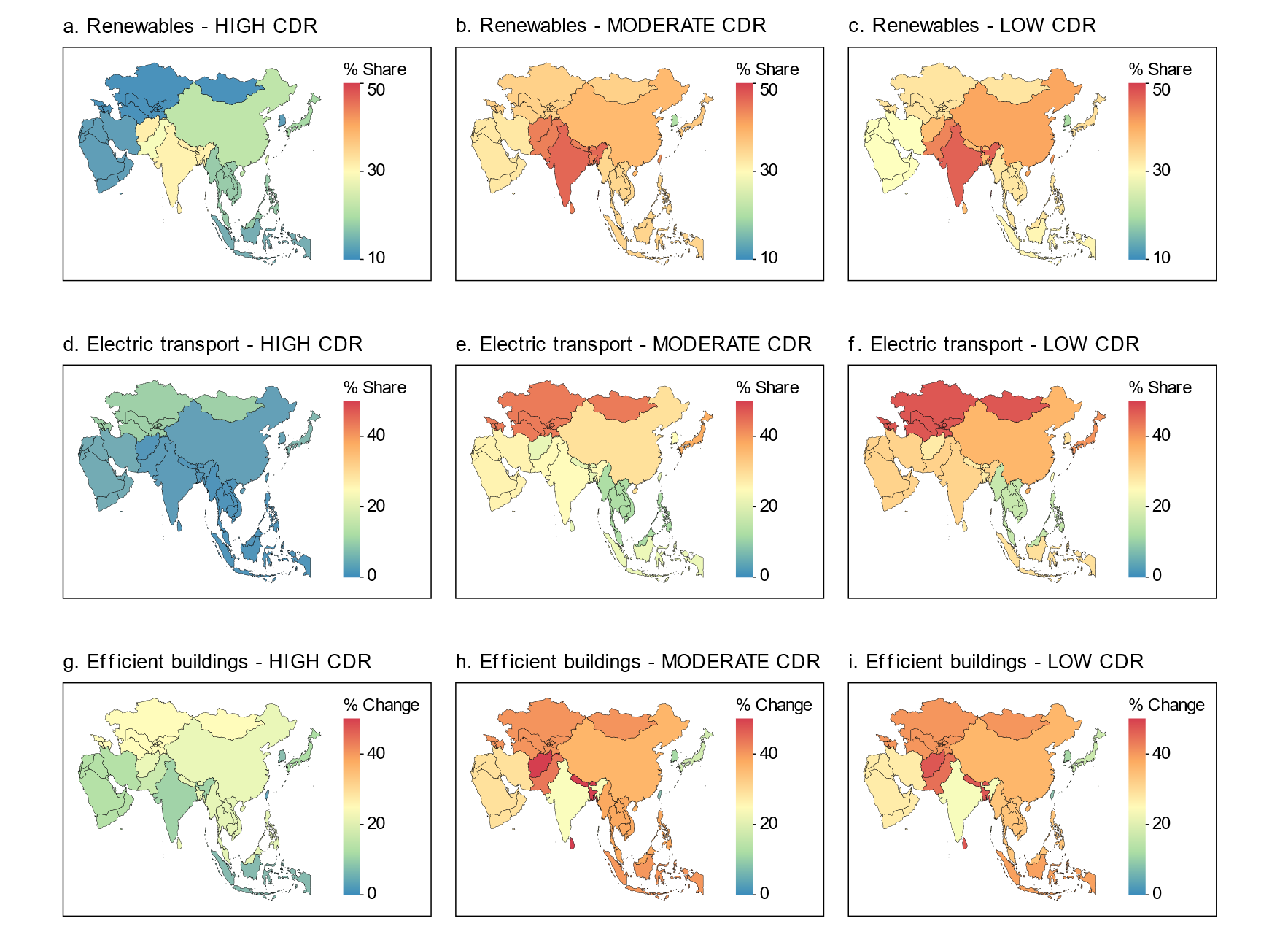 研究结果表明,过多使用CDR技术存在持续依赖化石燃料的风险,并阻碍向更清洁替代品的过渡(图1)。高CDR依赖的情景显示,所有部门都持续依赖碳密集型燃料和技术;相比之下对CDR技术的依赖程度越低,可再生能源、核能、节能建筑和电气化交通的采用程度就越高。图2则在空间上证实了这一点,在高CDR依赖情景中,亚洲任何地区或国家的最高交通电气化份额仍低于15%。相比之下,在中低CDR依赖情景下,电气化交通的份额将显著增长。