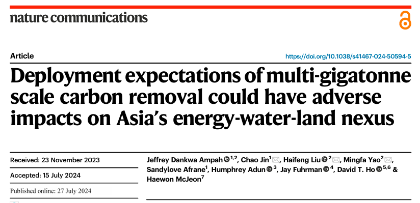 该工作以题为“Deployment expectations of multi-gigatonne scale carbon removal could have adverse impacts on Asia’s energy-water-land nexus”的论文发表于国际期刊《自然-通讯》(Nature Communications | 15: 6342, 2024,论文链接:https://doi.org/10.1038/s41467-024-50594-5),天津大学先进内燃动力全国重点实验室博士研究生Jeffrey Dankwa Ampah为论文的第一作者,金超副教授、刘海峰和尧命发教授为论文共同通讯作者。