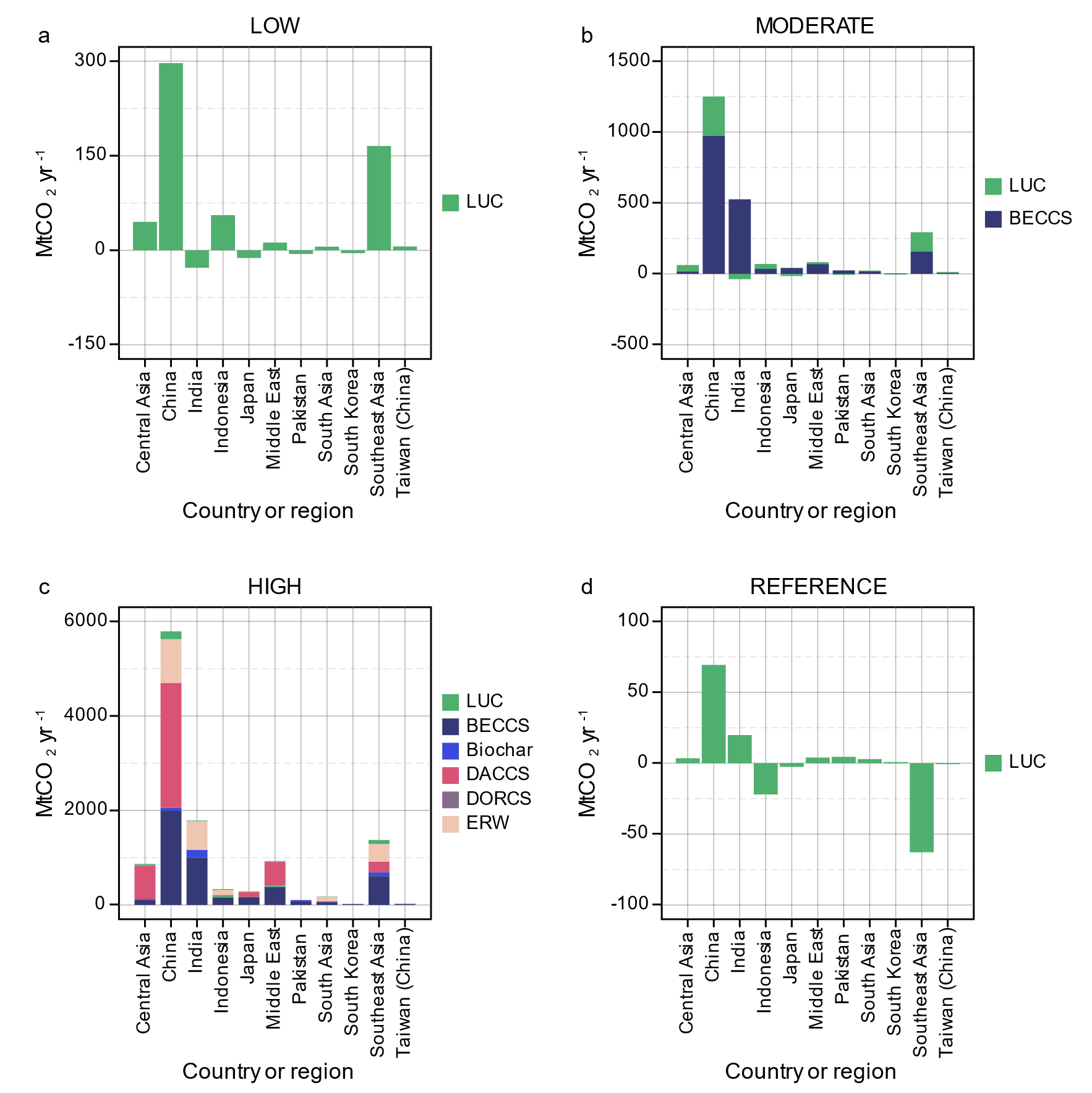 图3 到2050年,在各种CDR部署情景下,二氧化碳去除(CDR)在亚洲的分布